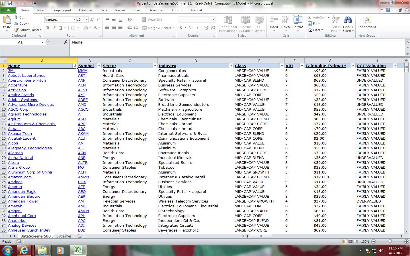 A Screenshot of the Valuentum DataScreener500