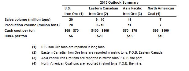 Capital management at the firm seems relatively weak, as the company had to write down $1 billion related to its acquisition of Thompson Iron Mines in 2011. The company also had to raise capital by selling 9 million shares of common stock and 20 million shares of preferred stock. With the firm giving relatively positive guidance (shown below) for 2013, we’re a bit shocked by this move since it has upset existing shareholders (Sources of Images: CLF).
