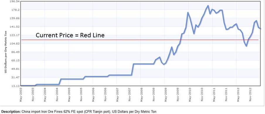 Above is a 10-year chart of iron ore prices, and we can see that prices have come a long way from 2003 (the far left of the chart). Using the conservative $110 per metric tonne we’re seeing in the spot market right now, prices are almost 7.5x higher than they were just ten years ago!