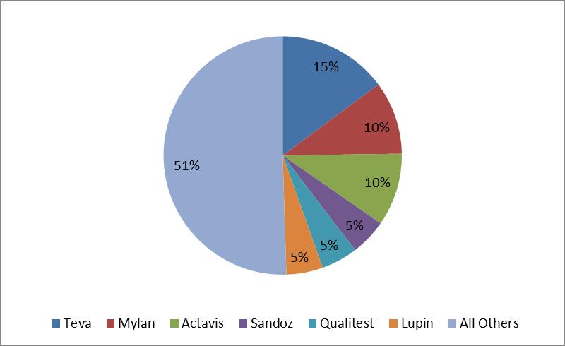 Novartis’ (NVS) Sandoz and Mylan (click ticker for report: ) also boast a compelling combination of first-to-files and total ANDAs on file. Such exposure is relatively consistent with existing US Gx market share (shown below), though Par and Apotex may make share gains in coming years. We estimate the US generics market is roughly $53-$55 billion annually.