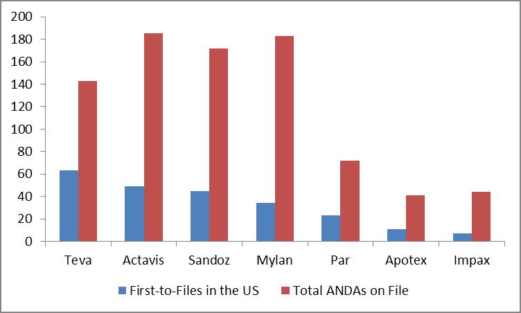 In the US, we point to Teva (click ticker for report: ) as having the greatest number of first-to-files and Actavis (click ticker for report: ), formerly Watson, as having the greatest number of total ANDAs on file.