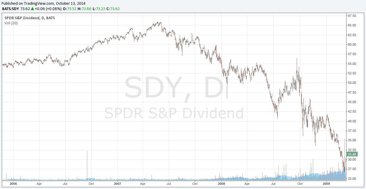 How far might we fall in this correction? We still believe we have 4%-6% more to go, and if we break lower than those levels, there is more psychology at work than fundamentals. It may take capitulation from the dividend growth crowd for us to truly reach a bottom. We wanted to share an interesting chart of the SPDR S&P Dividend Aristocrat ETF (SDY) heading into the March 2009 bottom. Dividend growth stocks are not immune to the broader equity market performance.