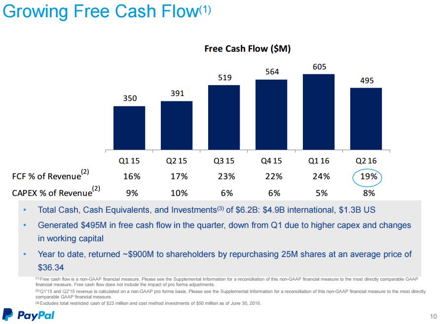 A quarterly “beat and raise” and a new agreement with Visa (V) weren’t good enough to drive shares of PayPal (PYPL) higher July 22, but we’re not worried. Revenue growth of 19% on a foreign-currency neutral basis and non-GAAP earnings per share growth of 11% wasn’t bad at all. Operating cash flow and free cash flow generation of $696 million (up ~12% year-over-year) and $495 million (up 27% year-over-year) in the quarter wasn’t too shabby either. Through the first six months of 2016, the company has generated $1.1 billion in free cash flow, better than the $740 million mark generated during the same period a year-ago. Active customer accounts advanced 11% in the quarter, and the company processed an impressive 1.4 billion transactions (up 25%) on $86 billion of volume (up 29% on an FX-neutral basis). PayPal continues to gain share, growing much faster than the broader pace of e-commerce expansion.