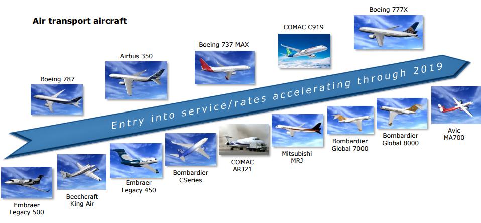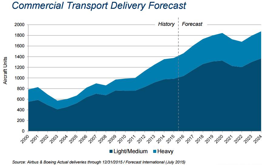 On the first day of the 2016 Farnborough International Airshow, Boeing released its widely-followed Current Market Outlook (CMO), calling for as many as ~39,600 new airplanes needed over the next 20 years, valued at ~$5.9 trillion. Airbus expects demand for ~33,000 new aircraft at a price tag of ~$5.2 trillion. The single-aisle market will account for the vast majority of those expected deliveries, namely the 737 and A320 family of aircraft, but also Bombardier’s (BDRAF, BDRBF) C Series (the first delivered June/July), Embraer’s (ERJ) E-Jet family and China’s Comac C919, which is targeting first flight by early 2017.