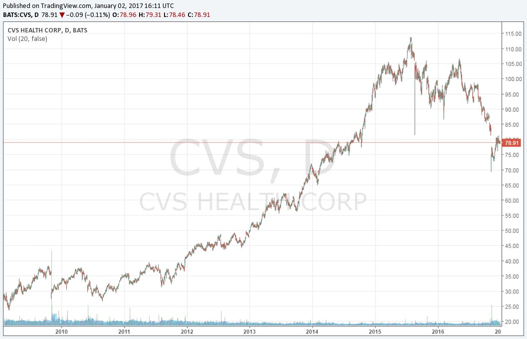 CVS Health (CVS) is generally categorized in the consumer staples (XLP) sector of the S&P 500, yet over 85% of their revenue is healthcare related! The consumer staples and healthcare sectors were notable laggards in 2016 with healthcare posting a loss for 2016. The lack of momentum in these companies is exciting from a contrarian’s point of view; the industry lacks froth, unlike the 2015 period where healthcare was all the rage. The lack of momentum is a positive as multiples have shrunk allowing value-conscious investors to consider building positions at favorable prices.