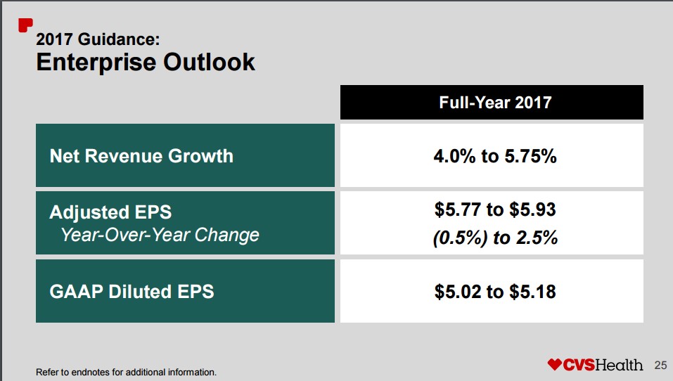 In essence, pharmacy remains a volume game — the higher the volume driven per location, the more profitable for the company. The greatest challenge facing management is the ability to grow revenue; yet in what is termed a poor year, CVS revenue growth will continue in 2017. Though the loss of prescription volume will negatively affect overall 2017 growth, as the year progresses, we expect the company’s expense base to be brought in line with the lower prescription volume, thus gearing CVS for a notable bounce in 2018. We’re excited about this.