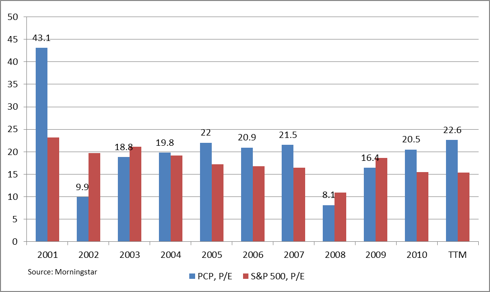 In fiscal 2013 (ending March 2013), Precision is expected to earn roughly $10 per share, with significant earnings expansion expected in the following year (fiscal 2014). Based on historical market tendencies and the trajectory of the firm’s growth, it would not be surprising to see Precision trade up to near $200 per share (20 x 10) within the next couple years.