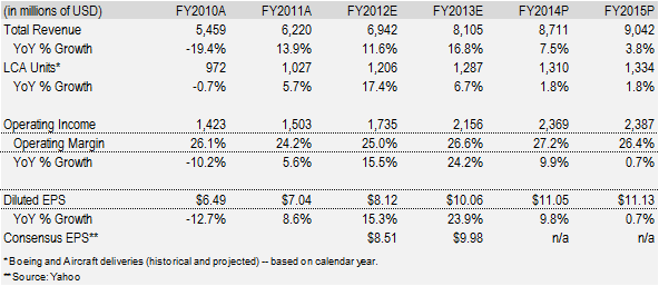 After viewing the chart above, Precision often garners a multiple in the high-teens / low 20s on trailing earnings during strong times in the aerospace sector. Interestingly, during the peak of the previous aerospace delivery cycle (in calendar 2007), the firm garnered roughly a 20x multiple on forward earnings for fiscal 2009 (which turned out to about $7.50). So, with this ballpark 20x multiple in mind (on a forward basis), let’s examine Precision’s earnings trajectory during the next few years.