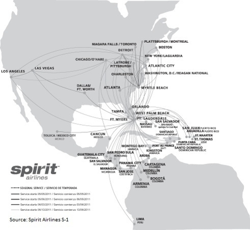 The firm’s unbundling pricing strategy (charging separate for advance seating and baggage) followed by corresponding fare price reductions is relatively unique in the industry–most airlines do not follow up willingly with a fare price cut. Such a strategy has driven non-ticket sales to over one third of total revenue in the firm’s first quarter of 2011. It further supports the view that intense pricing competition remains in the airline business, despite capacity rationalization and consolidation. Lower prices should also stimulate demand and spur continued growth in its target markets of the Caribbean and Latin America, out of its home base in Fort Lauderdale, Florida. The airline has firm commitments for 33 new A320 aircraft through 2015. That figure represents a near-doubling of the company’s fleet, to facilitate expected expansion plans. Its current route network is shown below: (Click to enlarge)