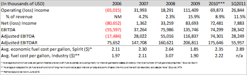 Jet fuel prices are by far Spirit’s largest cost item, representing over 30% of operating costs in 2010 and almost 40% in the first-quarter of 2011 (it has hedges in place for only 5% of its expected fuel needs for the remainder of this year). Though the high representation of jet-fuel prices in its cost structure is well above the industry average, this is more a function of Spirit’s lower labor costs (21% of operating costs in the first quarter of 2011) relative to other participants, than any operational issues. The firm’s historical profit performance and corresponding jet-fuel prices paid per period are shown below: (Click to enlarge)