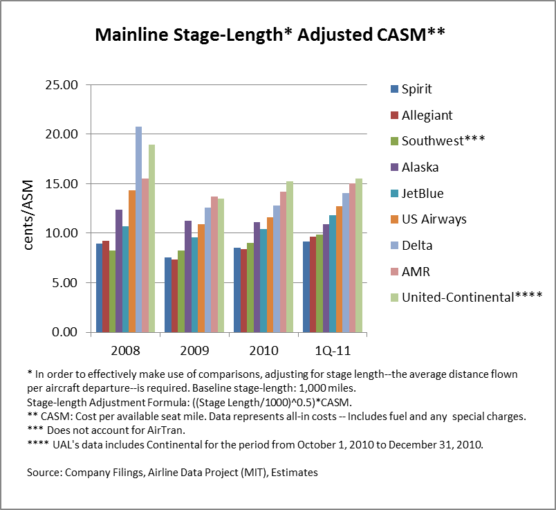 On an apples-to-apples basis, Spirit’s all-in, stage-length adjusted CASM ranks the best among airlines included in this study. There are two main drivers behind its ultra low-cost structure: 1) the operation of an all-Airbus fleet of 35 relatively new A320-family planes, which translates into lower maintenance costs and common flight crews (reduced training expenses, etc.); 2) the A320s have high-density seating configurations (178 passenger seats versus JetBlue’s 150), which allows the carrier to scale fixed costs more effectively.