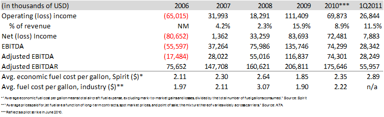 Jet fuel prices are by far Spirit’s largest cost item, representing over 30% of operating costs in 2010 and almost 40% in the first-quarter of 2011 (it has hedges in place for only 5% of its expected fuel needs for the remainder of this year). Though the high representation of jet-fuel prices in its cost structure is well above the industry average, this is more a function of Spirit’s lower labor costs (21% of operating costs in the first quarter of 2011) relative to other participants, than any operational issues. The firm’s historical profit performance and corresponding jet-fuel prices paid per period are shown below: (Click to enlarge)