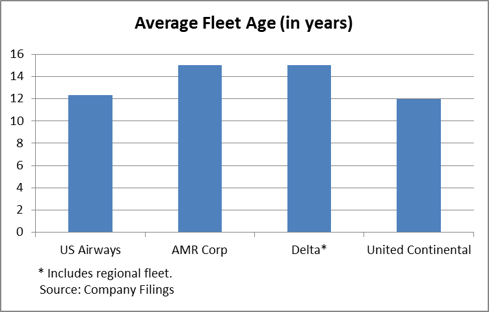 Shortly after we released our analysis of the fleets of the largest domestic carriers, The Wall Street Journal reported that AMR Corp. (AMR) is interested in ordering as many as 250 planes from either Boeing (BA) or Airbus (EADSY.PK). Our analysis, the summary graph of which we provide below, indicated that AMR is roughly on par with Delta (DAL) for having the oldest fleet (read fuel-inefficient) among the Big 4 domestic majors, so we view this move as inevitable.