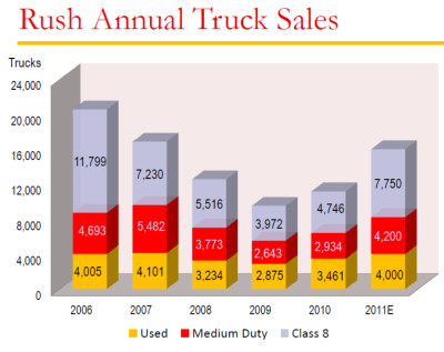 Rush Enterprises (RUSHA) is a full-service, integrated retailer of commercial vehicles and related services. Through its network of Rush Truck Centers, the company provides one-stop service for the needs of its commercial vehicle customers, including retail sales of new and used vehicles, aftermarket parts sales, service/repair stations, and financing/leasing-related products (Image Source: 2010 Annual Report).