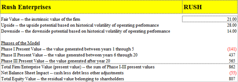On a discounted cash-flow basis Rush’s shares are worth about $21 each. Due to the timing of cash flows (free cash flow will be significantly negative this year), Rush is valued slightly lower under a DCF process than with traditional earnings multiple analysis. However, its prospects for outperformance during the coming commercial truck upswing indicate significant valuation support at today’s levels. - We make our DCF valuation model template available for investors here to use to value Rush and any other operating firm. And we would consider adding the company to our Best Ideas portfolio under $14 per share based on the downside estimate displayed in the table above.