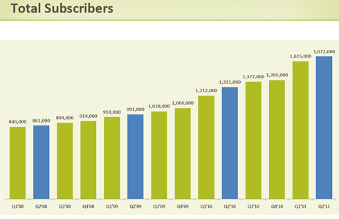 Ancestry.com is debt-free (read negligible financial bankruptcy risk), and as of the end of its second-quarter, held over $70 million in cash on its balance sheet. At 19x next year’s consensus earnings estimates of about $1.50, it’s trading just north of a market multiple on 30%-40% top-line growth and earnings that are doubling (look at the chart above — we’re not kidding). And with the release of the 1940 census in April 2012 — the biggest catalyst genealogical research has seen in a decade, we fully expect consensus numbers to be too conservative. We’re looking for about $2 per share in 2012, which makes Ancestry.com’s currently price levels almost ridiculous.