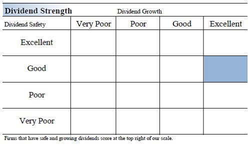 Let’s compare this to one of our favorite dividend growth names, Emerson Electric (click ticker for report: ). Emerson announced satisfactory earnings earlier this week and even raised its dividend by 2.5% compared to the previous period. The company is highly sensitive to macroeconomic conditions, and it has been able to provide investors with greater income, despite this broader weakness. Emerson’s matrix is provided below (it scores a 1.9 on our Dividend Cushion):