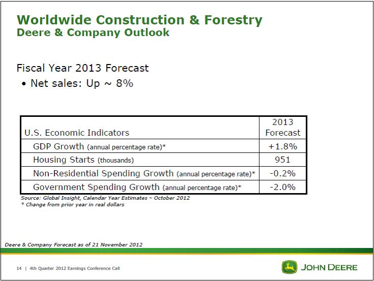Construction & Forestry sales were less exciting, growing 7% year-over-year to $1.7 billion, though operating earnings jumped 38% to $120 million. This segment is just a fraction of the size of the agricultural segment, but the improving housing market has helped re-accelerate sales of Deere construction equipment. Given the firm’s dire forecast for government spending in 2013, we think the outlook for 8% sales expansion (see slide below) will be a bit higher if the fiscal cliff is avoided.