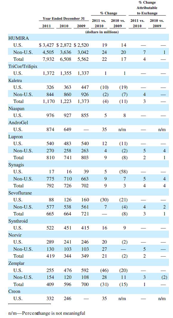 Andro Gel is another of AbbVie’s fast-growing drugs, with sales growing 35% in 2011 to $874 million. Approved for the treatment of low testosterone, we think the drug will continue to gain popularity as aging males seek ways to mitigate the impact of aging. With men living longer and healthier lives, the benefits of a drug like Andro Gel have become even more pronounced. Although plenty of non-FDA approved (and some illegal) measures exist, we think consumers will opt for a process that can be professionally supervised.