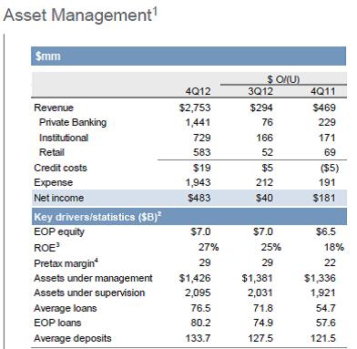 The firm’s high-return asset management business continues to perform well, too. As the image to the right reveals, net income surged, as assets under management and supervision advanced (Image Source: JPM Q4 2012 Earnings Presentation). Compared to many of its peers, JP Morgan remains light in wealth management, and we think the segment can become a meaningful profit driver going forward.
