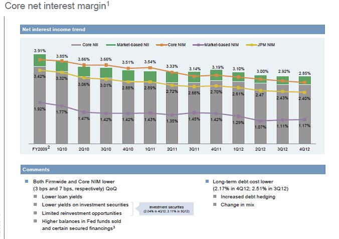 P Morgan CEO Jamie Dimon thinks the trend in NIM will eventually reverse itself, but continued compression will likely impact 2013 profitability in the Consumer & Business banking unit for some time to come. As the comments above show, reduced loan yields and lower return expectations on investment securities (particularly in the fixed-income market) are the main drivers.