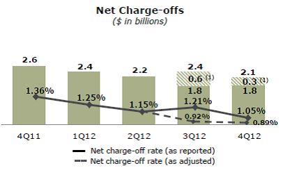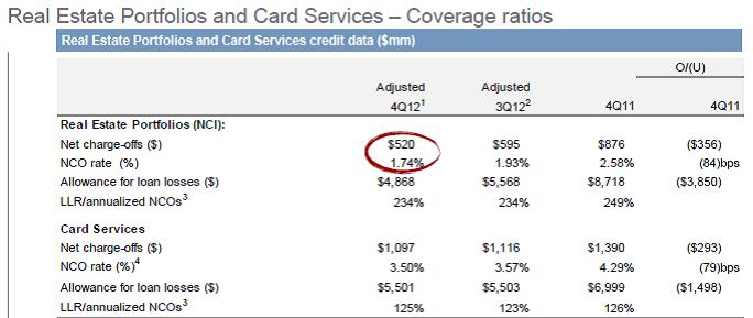 JP Morgan reported better than anticipated earnings of $1.39 per share, but the firm’s net interest margin (NIM)—return on deposits less the cost of deposits—continues to decline. As the graph below shows, the bank’s NIM has fallen to 2.4% in the most recently-reported quarter from 3.42% in fiscal year 2009 (Image Source: JPM Q4 2012 Earnings Presentation). Such a trend remains an ongoing problem with the banking sector as a whole, but the weakness is not tragic and does not alter our long-term thesis on the group, which is tied to improving real estate markets and stronger consumer credit quality (and better loan performance).