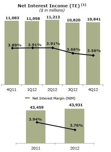 Similar to JP Morgan, Wells Fargo, the nation’s largest mortgage originator, exceeded estimates by a few pennies, earning $0.91 per share during the fourth quarter. As the chart to the right shows, net interest margins were also weak at the bank, falling 10 basis points sequentially and 33 basis points from the mark achieved in the fourth quarter of 2011 (Image Source: WFC Q4 Earnings Presentation).