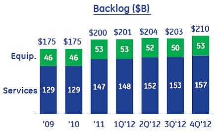Total revenue advanced 4% as industrial organic expansion increased at a similar rate. Adjusted orders jumped 7% in the quarter, and the company’s backlog swelled to $210 billion, a new record (Image Source: GE 4Q Earnings Presentation). GE’s operating margins increased 120 basis points during the period, and fourth-quarter operating earnings per share expanded 13% from the same quarter a year ago. All of its industrial segments experienced earnings growth, with five of the seven industrial segments putting up double-digit bottom-line expansion. GE Capital posted $1.8 billion in earnings during the quarter, and its Tier I common ratio came in at a healthy 10.2%. The industrial powerhouse continues to be a cash cow, as it hauled in roughly $17.8 billion in cash from operating activities during the year. GE now holds $77 billion of consolidated cash and cash equivalents, offering substantial support for share repurchases and increased dividend payments. During 2012, GE bought back roughly $5.2 billion in stock, and just last month, it raised its quarterly dividend 12%, to $0.19 per share—its fifth increase in three years ().