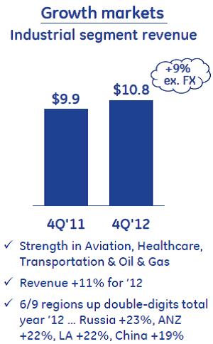 GE is perhaps the most important indicator of the health of the industrials end market, where segment revenue advanced 9% in the quarter, excluding currency (Image Source: GE 4Q Earnings Presentation). As far as assessing the ongoing strength of the sector, the firm’s all-time high backlog is quite telling. Though there was weakness in wind turbine orders during the period, the ratio of equipment orders received to orders billed (or its book-to-bill ratio) came in at a healthy 1.2. Such performance bodes well for many industrial firms, especially when viewed in conjunction with the ~1.5 book-to-bill ratio recorded during 2012 at the airframe makers, Boeing (click ticker for report: ) and Airbus. During the quarter, CFM International (a 50/50 joint venture between GE and Snecma) announced a commitment from Alaska Airlines (click ticker for report: for the purchase of CFM engines to power 50 new Boeing 737 aircraft, and we’re fans of GE’s agreement to purchase the aviation business of Avio S.p.A. The Italy-based company will complement GE’s position in aviation and other engine components, and we have no qualms with the purchase price (8.5 times EBITDA). Overall, we think GE’s increasing exposure to aerospace is a distinct positive.