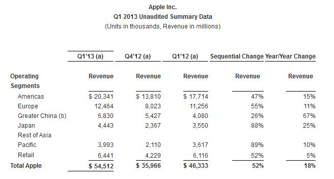 On a geographic basis, Apple experienced fantastic growth in China (shown below). Though performance was a bit underwhelming in Europe, we can’t help but focus on those numbers in China, which debunk the myth that the firm needs to make a low-end iPhone. While year-over-year sales growth in the rest of the Asian market (excluding Japan) wasn’t too strong, we think the solid results in China are far more important for the company at this time.