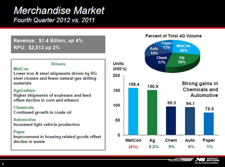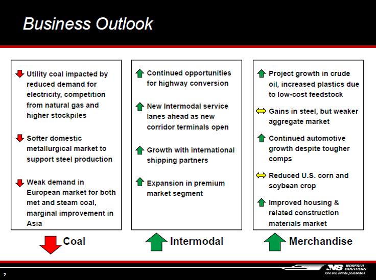 Coal revenue was down 23% compared to the same period a year ago, which weighed heavily on the company’s total revenue and earnings. Unfortunately for Norfolk, the firm isn’t very optimistic about coal heading into 2013 (shown below). However, we like the prospects for global economic growth, so we think there is some upside to the forecast (Image Source: NSC 4Q Earnings Presentation).