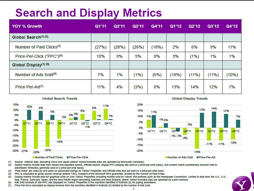 Search (details shown in image below) continues to lag the market leader Google (click ticker for report: ), but Mayer has seen how Google executes, so we’re optimistic about the business going forward. Search revenue ex-TAC jumped 14% compared to the same period a year ago to $427 million, with the price-per-click advancing 1%. Although competition is fierce, ranging from Google and Bing (click ticker for report: ) to Facebook (click ticker for report: ), gaining search share on mobile devices could materially move the top and bottom lines. We’ll be watching what direction Yahoo! takes in the mobile space very closely (Image Source: YHOO Earnings Presentation).