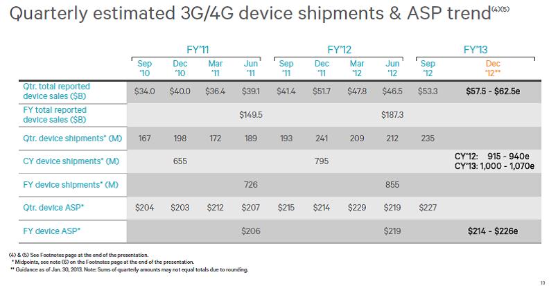 If there’s any beneficiary of the smartphone revolution, it is most certainly Qualcomm. Aside from perhaps the phone carriers themselves, Qualcomm is the most OEM agnostic way to play massive smartphone growth. As the above chart shows, average selling prices continue to grow, and shipments look to exceed 1 billion units in Qualcomm’s 2013 fiscal year (shown above). While there’s no doubt Qualcomm benefited from spectacular iPhone 5 (click ticker for report: ) growth this year, the company can make a lot of money regardless of which OEM does well.