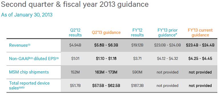 Chipmaker Qualcomm (click ticker for report: ) posted a fantastic first quarter, continuing its momentum from fiscal year 2012 into 2013. Revenue surged 28% year-over-year to $6 billion, easily exceeding the consensus estimate. Non-GAAP earnings were also better than the consensus anticipated, growing 30% year-over-year to $1.26 per share (Image Source: QCOM Earnings Presentation).