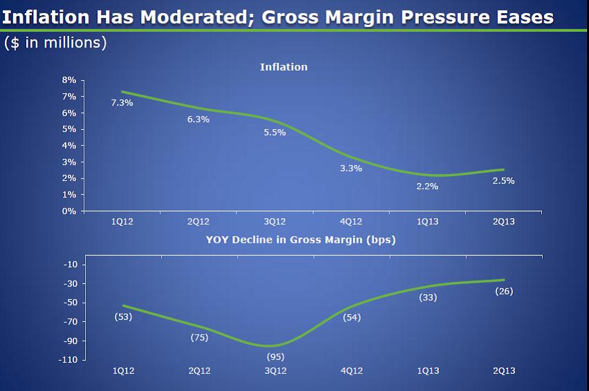 Gross margins (shown above) at Sysco were down 26 basis points year-over-year to 17.8%, driven mostly by food cost inflation, which was 2.5% during the quarter. For a retailer that that consistently posts 50%+ gross margins, a 30 basis-point swing is largely immaterial. However, Sysco runs on rather thin net margins, so any cost increases have a disproportionate effect on the bottom line. Although it appears inflation is trending downward, the growing season is always uncertain, so inflation could easily reaccelerate in Sysco’s second half of fiscal year 2013 (something we are watching very closely). With gross margins languishing, operating expenses jumped 40 basis points as a percentage of sales to 14.2%, though much of the increase was due to restructuring expenses. In order for the company to grow earnings with cost inflation relatively high, operational cost containment will have to drive sales leverage (Image Source: SYY 2Q Earnings Presentation).