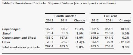 Smokeless products, though a considerably smaller segment, experienced revenue growth of 7%, which boosted adjusted OCI 9.5% higher year-over-year to $254 million. On a comparable basis, smokeless tobacco is even more profitable than the smokeable variety, and we saw tremendous growth in shipments of both Copenhagen and Skoal during the fourth quarter.