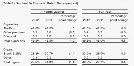 Altria’s share gains at Marlboro drove smokeable products revenue higher during the fourth quarter. The firm’s market share increased one percentage point versus a year ago and was 0.6 percentage points higher by the end of 2012 versus the end of 2011. Such brand strength resulted in revenue expansion (net of excise taxes) of 3.6% to $3.8 billion (up 2.4% to $5.6 billion including excise taxes). Even though total smokeable products volumes advanced 0.4%, the company was able to selectively raise prices, which resulted in adjusted operating income (OCI) margins of 39.9% (which were an impressive 90 basis points higher than the previous year). Adjusted OCI for the smokeable segment increased 6% year-over-year during the quarter and advanced 4.2% for the full year. We think the firm’s Marlboro brand will remain resilient, and the company’s solid market share continues to hold up in the face of competitive challenges (Image Source: Altria).