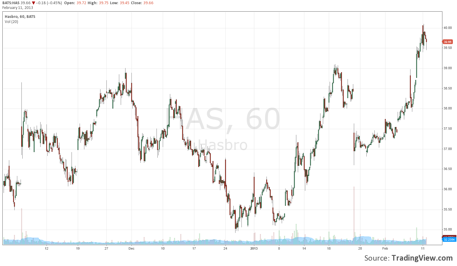 After pre-announcing weaker than anticipated fourth quarter results at the end of January, Dividend Growth Newsletter portfolio holding Hasbro (click ticker for report: ) updated investors with its final results. Revenues were down about 4% year-over-year to $1.28 billion, while earnings for the quarter were 13% higher year-over-year at $1.20 per share (net of restructuring charge). As a result, full-year earnings were $2.55 per share, down 10% compared to 2011. However, excluding restructuring charges and foreign exchange variations, earnings for the year were $2.91 per share—a slight increase on a year-over-year basis. As Valuentum members are well aware, Hasbro’s stock performance has been very strong as of late (and such equity performance doesn’t consider its hefty dividend payout).