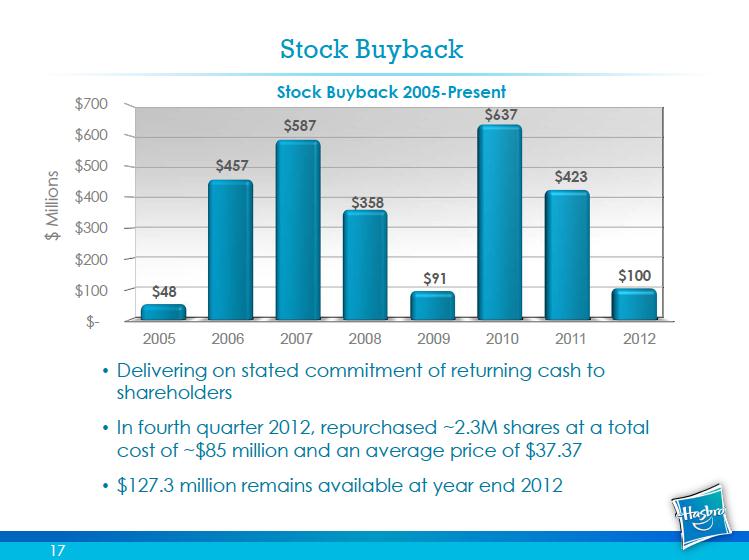 Although earnings were not amazing by any stretch, we were fairly satisfied overall with the year’s developments. The firm increased its dividend 11% to $0.40 per share on a quarterly basis—meaning the annual dividend yield at current levels is 4%! In addition to raising its dividend, the firm repurchased $100 million worth of stock during 2012, well below its recent trends (shown below). The firm has been very prudent with its capital management, and it remains focused on returning cash to shareholders. We expect to update our dividend report on Hasbro soon (Image Source: Hasbro).