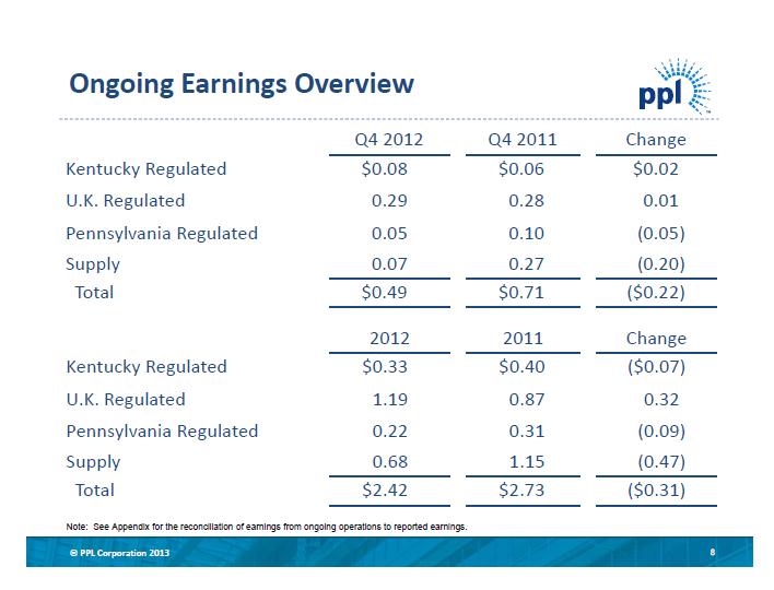 In its Regulated Pennsylvania business, earnings were halved during the fourth quarter, while the annual EPS contribution fell nearly 30% compared to the same period a year ago. Regulators did approve a rate hike that will help boost annual revenue by $71 million. Due to the rate increase (took effect January 1, 2013), the company sees segment earnings increasing 30% in 2013.