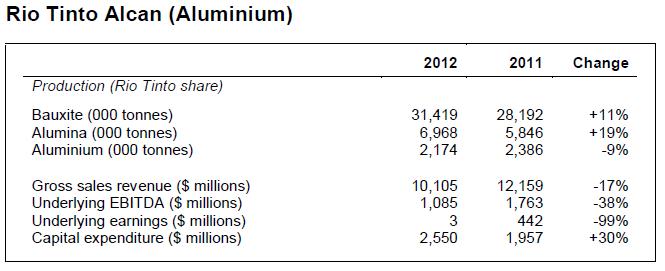 The broader aluminum market was absolutely terrible in 2012 thanks to a substantial decline in prices. In fact, Rio took a pre-tax impairment charge of $12.4 billion to reflect the negative changes in the broader aluminum market. Production is expected to rise for bauxite, alumina, and aluminum in 2013, though pricing remains uncertain going forward. Lowering cash costs will be most important, and we think such is certainly attainable given Rio’s track record of strong operational performance. Like so many deals that consummated during the past five years, the company ended up purchasing assets near a market peak, making the deal highly destructive to shareholder value. While the previous CEO takes the blame, we hope current CEO Sam Walsh takes a more disciplined approach to asset acquisition.