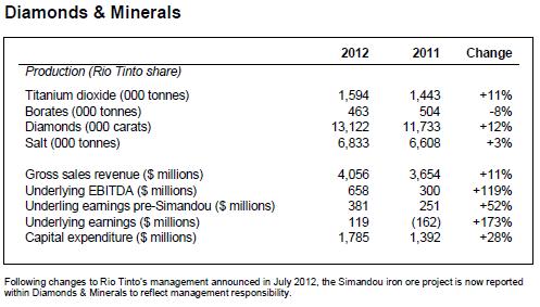 The firm’s Diamonds & Minerals segment was a bright spot for Rio during 2013, with revenue jumping 11% and underlying EBITDA up 119%. Titanium dioxide production jumped 11%, allowing the firm to capitalize on higher prices during the first half of 2012. Unfortunately, the industry has been struck by oversupply as of late, so it appears 2013 could be a challenged year.