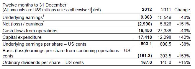 Rio Tinto only swung to a loss due to an asset impairment charge, but underlying earnings and operating cash flow still fell 40% year-over-year. Unfortunately for Rio, this came at the same time that the company increased capital spending by more than $5 billion to boost capacity. As such, the firm burned through $1 billion in cash (CFO less capex). Normally we would find an event like this very problematic, but Rio intends on generating annualized cash cost savings of $3 billion that could result in $5 billion of savings in 2013 and 2014 alone. Cash flow looks almost certain to improve, and frankly, the year could not have been worse for most commodity producers (we think the firm did a fairly solid job of generating cash). China, the world’s largest resource hog, could return to 8%+ growth this year, which in turn would lift the fortunes of all of Rio’s businesses. Commodity prices alone accounted for $5.3 billion worth of the earnings decline—even though volumes were higher.