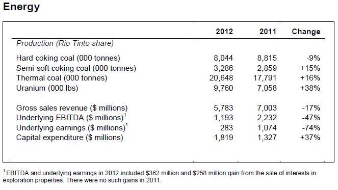 Rio took a write down to account for the diminished value of its Mozambique operations, but the company is more interested in boosting capacity and investing in productivity. The Mozambique mine in particular remains constrained due to a lack of supporting infrastructure—always an important risk for miners who invest in underdeveloped economies. Looking ahead, production of hard coking and semi soft coking is anticipated to increase to 8.5 million tonnnes and 4 million tonnes, respectively, but production of thermal coal and uranium is anticipated to fall to 20.5 million tonnes and 9.5 million pounds. Both thermal coal and uranium experienced dramatic volume increases in 2012, so we aren’t too worried about a slight pullback.