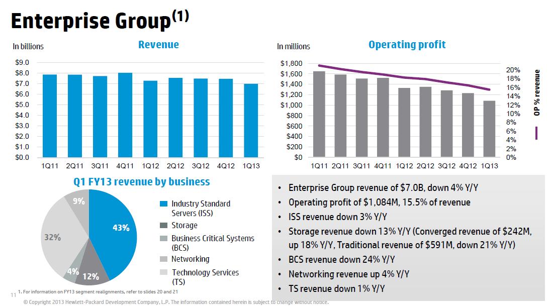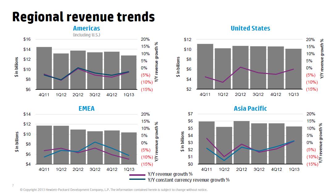On a geographic basis, we were pleased to see the pace of HP’s revenue declines moderate across the board, except for Europe (only Asia-Pacific posted growth—of 1%). The enterprise technology space is tempered, and we believe demand will improve once economic conditions cooperate (Image Source: HPQ).
