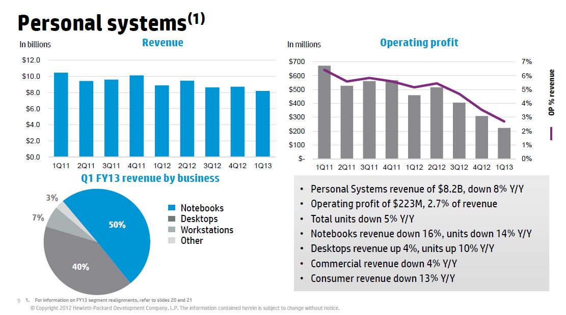 “Our effective inventory management positioned us well to capture a stronger share in Windows 8 form factors relative to the competition this quarter. While Windows 8 was not a significant enough catalyst to step the experienced the continued to be excited about our new product offerings placed into the market. That’s clearly the margin of this business are still not where we want them to be and the top line pressures in particular with notebooks are significant. The business is facing a broader market downturn and we have a lot of work to do to get this business back on track.”