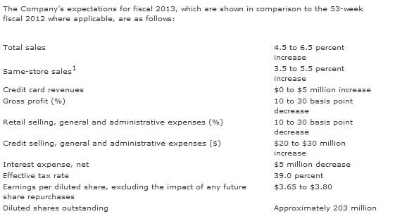 Although we’d love to see strong free cash flow expansion, we’ve learned from the Sears (click ticker for report: ) experience what happens to companies that underinvest in stores. Free cash flow in fiscal year 2012 was down nearly $70 million to $597 million, so we’ll need to see some strong growth in operating cash flow to keep free cash flow stable, especially since management explicitly stated it doesn’t see any EBIT (operating income) margin expansion ahead.