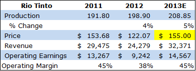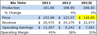 Supply remains the largest threat to Rio’s profitability and cash flow because significant mining supply is coming on-line at Rio, Vale, and Anglo American’s Minas Rio project. In effect, large amounts of iron ore supply could come to market at the same time demand growth moderates to reflect less robust demand from China. While certainly a valid concern, we think these fears may be slightly overblown and underestimate other emerging markets’ role in consumption. Further, Chinese real estate steel demand growth may decelerate, but the country will still add several millions of cars to the road over the next decade. Vale’s CFO concluded that long-term, prices are likely to fluctuate between $110 and $180 per metric ton, strong enough for Rio and other low cost miners to earn positive operating margins. We’ve provided a sensitivity analysis on iron ore prices below. (Revenue, operating earnings, production in millions).