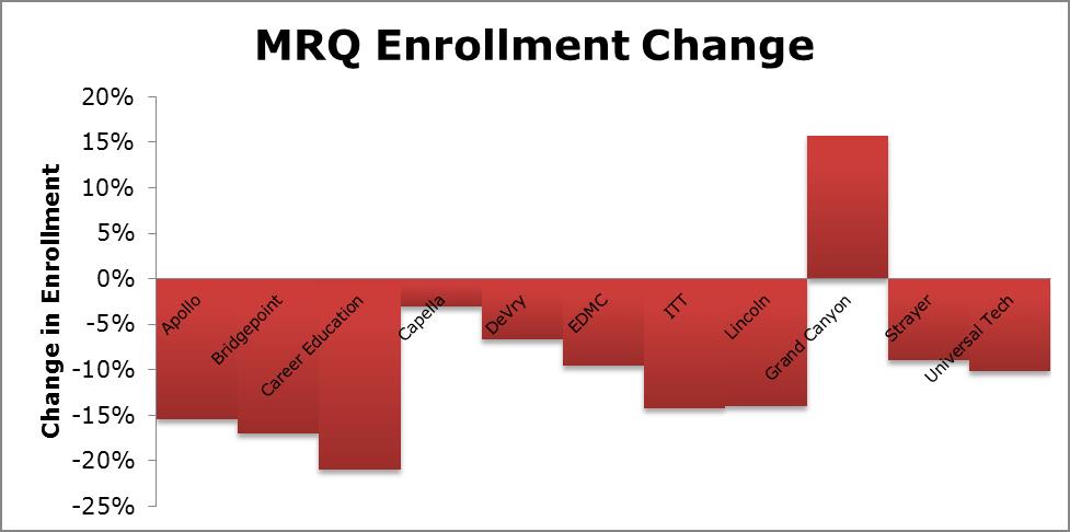 Nearly every constituent faced a double-digit drop in enrollment, and only Grand Canyon (click ticker for report: ) increased enrollment. We believe there are several factors driving the enrollment declines, as we outline below.