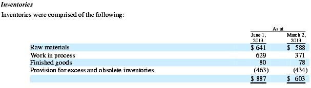 As far as the balance sheet is concerned, the firm’s cash position isn’t much different than the prior quarter, sitting at $2.8 billion versus $2.6 billion. Our big concern here is inventories, which increased 47% sequentially to $887 million ahead of the BlackBerry 10 global rollout. Unfortunately, we’re not too excited about the potential of BlackBerry 10, particularly in the Western world, and we fear the company could be sitting on hundreds of millions of dollars of inventory that may be difficult to move. BlackBerry’s inventory detail indicates that moving old product has become a slightly more prominent issue.